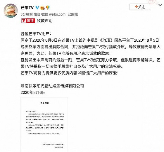 《琉璃》(原名《琉璃美人煞》)由欢瑞世纪、优酷、万达影视、新媒诚品、卓见集嘉联合出品,芒果TV原本通过某种置换协议拥有了《琉璃》的播映权,然而就在播出前夕,芒果TV却发布声明,优酷单方面提出解除合同,并拒绝向其交付播放介质。