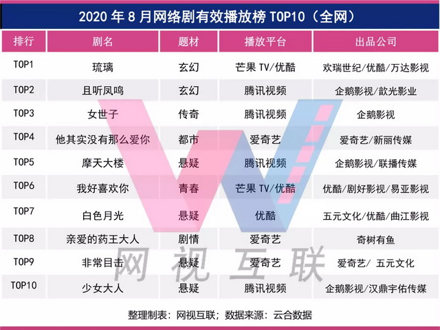 根据云合数据提供的有效播放数据,网视互联(ID:wxs360)整理出了8月份网剧有效播放排行榜TOP10。