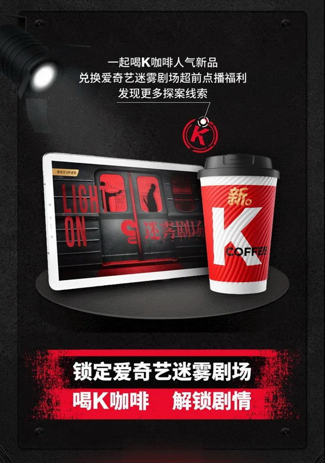 针对迷雾剧场的剧集特点,爱奇艺联合肯德基推出了限量1000万份的K COFFEE杯体设计提供迷雾剧场6部剧的专属线索,将剧情与线下大众消费场景深度联动;同时,爱奇艺VIP会员可以领取免费的K COFFEEK产品及其优惠券,而会员购买 COFFEE产品还可以获赠迷雾剧场超前点播权益。