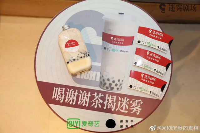 此外,迷雾剧场还跟谢谢茶推出了“喝谢谢茶揭迷雾”活动,用户参与话题互动就有机会获得爱奇艺会员卡、迷雾周边、谢谢茶手摇奶茶等奖品。通过购买“迷雾款”谢谢茶还可获得定制杯套,集齐所有剧集杯套,还有机会获得主演签名照、和惊喜大礼包。