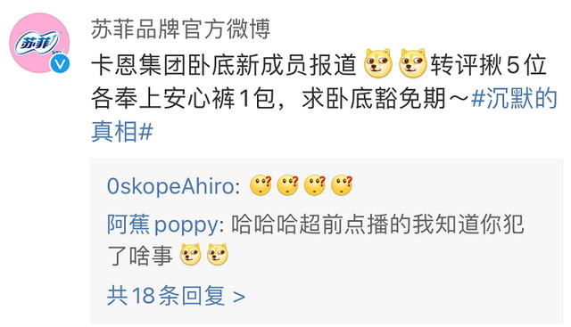 #沉默的真相 广告植入#登上热搜的第一时间,良品铺子、安慕希、莫小仙、999感冒灵等众多在剧中投放广告的品牌主就第一时间下场“接梗”,纷纷承认自己是卡恩集团的卧底,喊话用户共寻线索探案,顺势刷了一波好感和热度,《沉默的真相》也因此而得到了意想不到的进一步扩散。