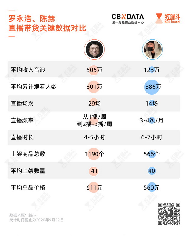 在直播电商“爆品单价不过百”的大前提下,二人都是难得可以带货高价产品的主播。罗永浩上架商品平均单价达到611元,陈赫也有560元之高。
