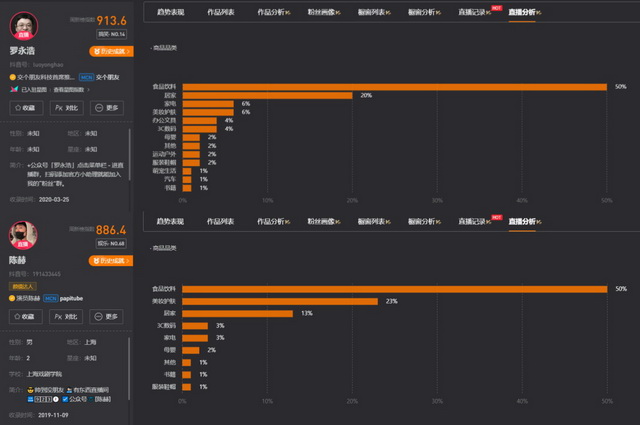 从品类来看,食品饮料在两个直播间均占据半壁江山,但家电、3C数码和运动户外用品在老罗直播间也位居前列,“直男”特色鲜明。此外,旅游套餐、高端酒水、金饰等高单价产品都是二人直播间里的常客。