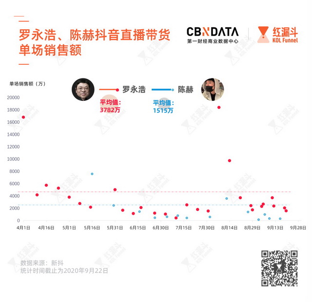 当然,罗永浩最后还是在直播江湖与陈赫相遇。截至9月22日,陈赫共直播14场,罗永浩直播了29场。从散点图来看,罗永浩的销售数据几乎全部在陈赫之上。罗永浩平均每场可卖出3782万,是陈赫的2倍有余。