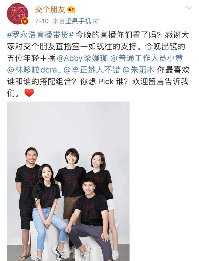 第二种是外部颜值主播。交个朋友官方微博显示,魏莹venus、小菠萝都是交个朋友近期签约的新主播,她们分别在9月4日,以及9月26日、27日现身罗永浩直播间。