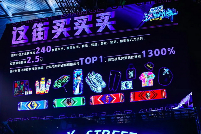 据刘栋介绍,《街舞3》共推出240多款衍生单品,覆盖服装鞋帽、食品、饮品、美妆、家居、培训等六大品类,整体营业额已突破2.5亿,刷新了优酷综艺官方衍生品的新纪录。