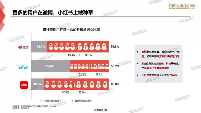 从各平台用户分布来看,微博平台近8成的用户都曾被种草,且微博在大体量、大众化用户优势之下男女比率较为均匀;相比而言,B站的科技、游戏等垂类文化吸引了大量男性用户;小红书一如既往,女性被种草用户较多。