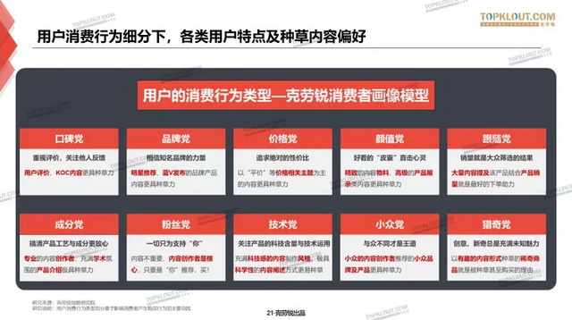 从消费行为角度进行细分,用户可以划分为10种用户类型,不同的用户有着不同的消费特点及种草内容偏好。如口碑党更注重他人的评价,所以更偏好评论区、KOC内容种草;颜值党更易被“好看的皮囊”所吸引,精致的内容物料及产品展示极具种草力。