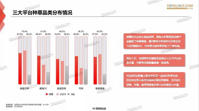 总的来说,从各个品类在三大平台的种草情况来看,微博的大众化为食品饮料、美妆个护等高频消费产品奠定了种草基础,专业KOL也为数码3C、汽车等内容开拓了市场;美妆个护、母婴等女性强相关品类在小红书平台蕴藏着丰富的内容。