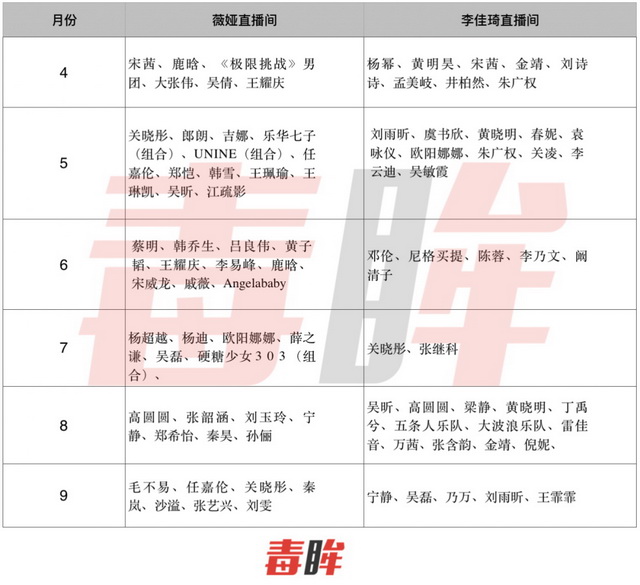 此外,一位品牌方宣传向毒眸透露,品牌曾想让一位流量男星上直播,去年他们非李佳琦直播间不去,但今年优先级变成了薇娅。如上文图表所示,近六个月来进入薇娅直播间的当红男女明星,也多于李佳琦。