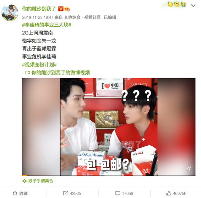 10月26日和11月3日,周震南、朱一龙走进李佳琦直播间,对直播一头雾水的男明星与伶牙俐齿的李佳琦碰撞出不少笑点,当时微博网友编了一则段子:“2G上网周震南,惜字如金朱一龙,青出于蓝赖冠霖”,初期进入李佳琦直播间的明星,都留下了鲜明的记忆点。