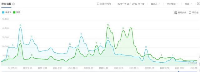 一个是主咖,一个是主咖的“素材”,这一阶段的李佳琦相较于薇娅具有明显的话题优势。但近半年以来,这种优势变得微弱。