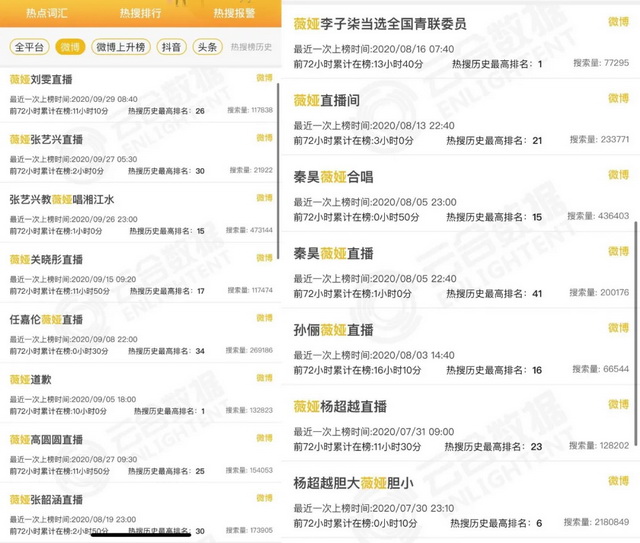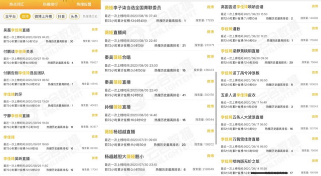 如今从薇娅、李佳琦直播间里诞生的热搜,也大都围绕明星展开。据云合数据显示,8月和9月薇娅上过13次热搜,其中有10次是明星相关热搜;李佳琦8月和9月共上过20次热搜,其中14次与明星相关。