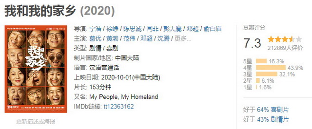 《我和我的家乡》作为国庆档票房TOP1,不仅票房不及《我和我的祖国》,口碑也同样有所差距。《我和我的祖国》豆瓣评分7.7,《我和我的家乡》豆瓣评分仅7.3。