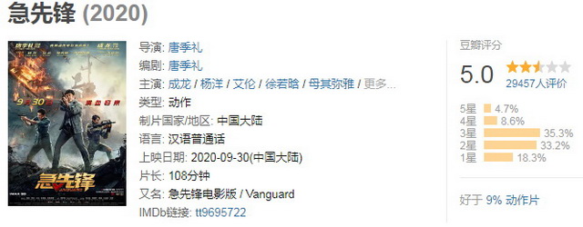 不止《我和我的家乡》《姜子牙》,今年国庆档影片普遍不及去年,《夺冠》豆瓣评分7.3,《急先锋》豆瓣评分5.0。