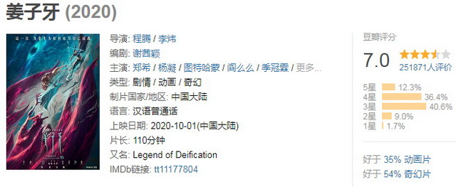 《姜子牙》虽然票房也算亮眼,但还是遭遇了高开低走的窘境,《姜子牙》跟《哪吒》在票房上的差距其实也同样显示在了口碑上。《哪吒》豆瓣评分8.4,150W+人评价,而《姜子牙》豆瓣评分7.0,25W+人评价。