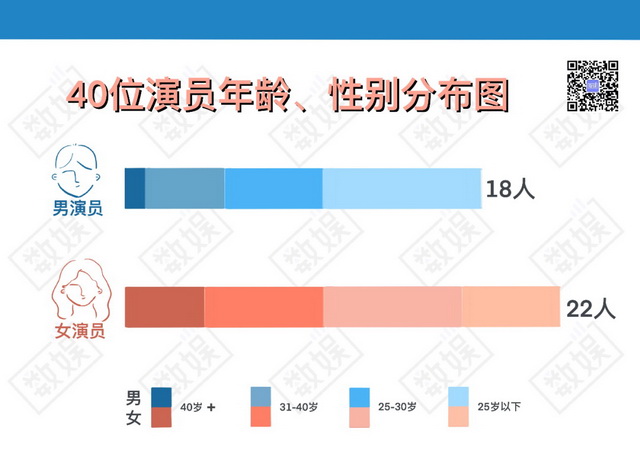 参赛的40位演员中,一共有18位男演员和22位女演员,比例大抵均衡,只是在男女年龄的占比上出现了明显差异。