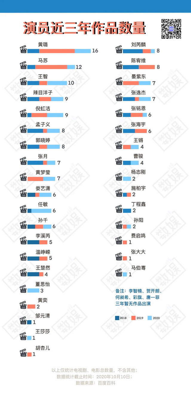 排名第一的黄璐极其高产,多达16部,不过虽然出演了不少,但基本都是没能公映的中小成本文艺片,属于圈内自嗨状态,排名第二的马苏过去两年则多以非主要角色出现在一些中小成本电影里,电视剧资源几乎为零,看得出来之前李小璐“夜宿门”事件对她的业务主场影响极大。