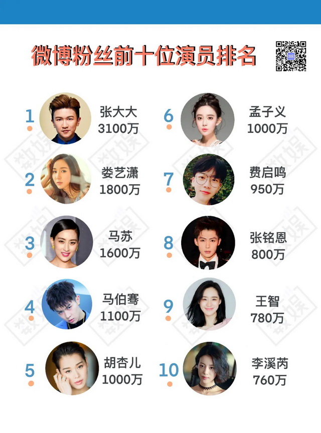 而最能体现演员大众知名度的“微博粉丝”维度,我们从高到低排出了前10名。