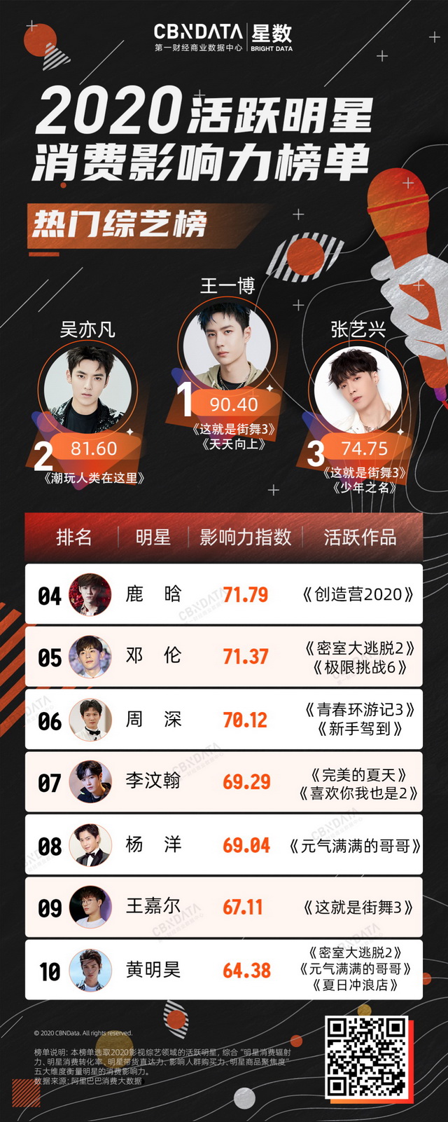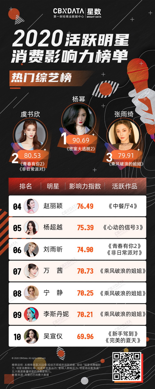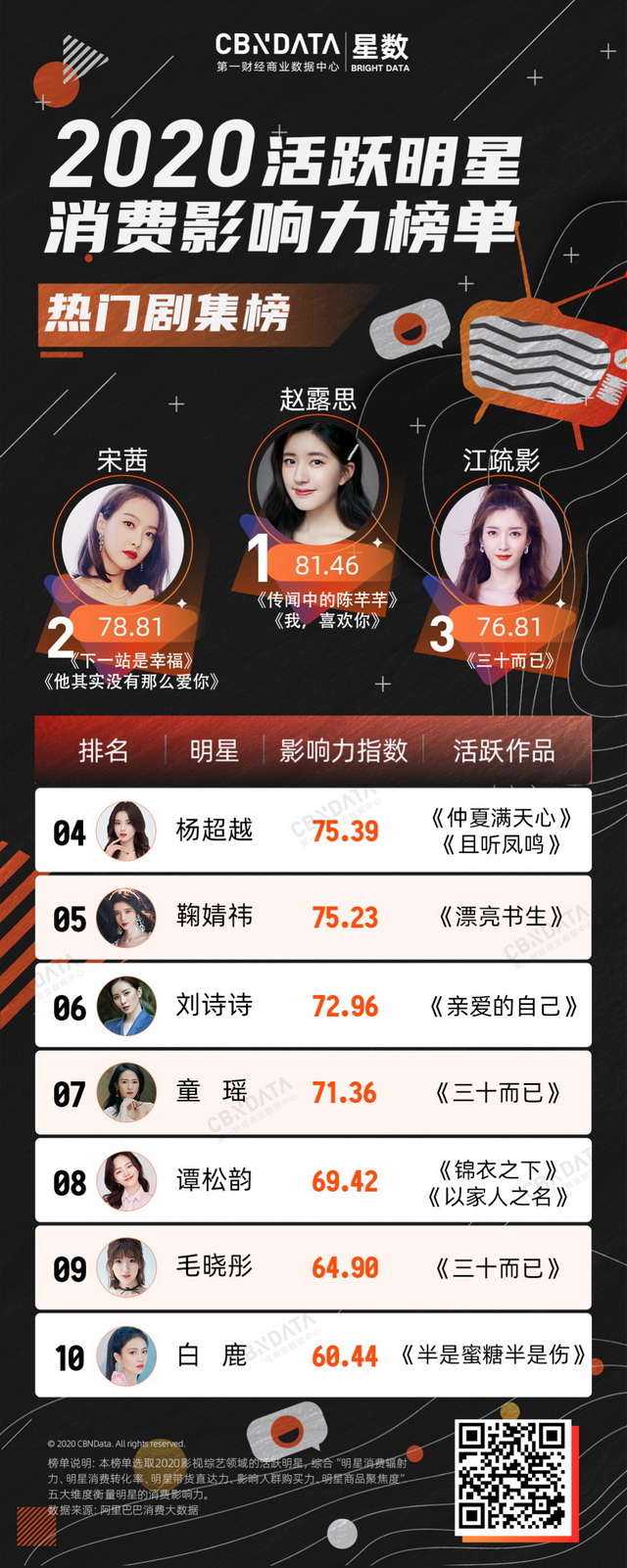 通过爆款内容走红的明星,在消费影响力方面表现如何?CBNData星数选取了2020影视综艺领域的活跃明星,综合“明星消费辐射力、明星消费转化率、明星带货直达力、影响人群购买力、明星商品聚焦度”五大维度衡量明星的消费影响力。
