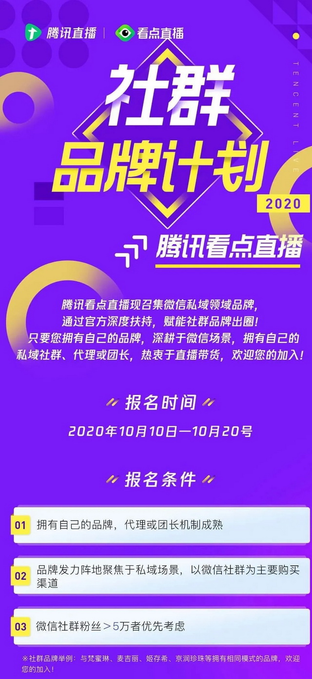 10月13日,腾讯看点直播推出微信社群品牌扶持计划。据腾讯直播助手官微,报名品牌需要满足三点:有自己的品牌,代理或团长机制成熟;品牌聚焦私域场景,以微信社群为主要购买渠道;微信社群粉丝>5万者优先考虑。