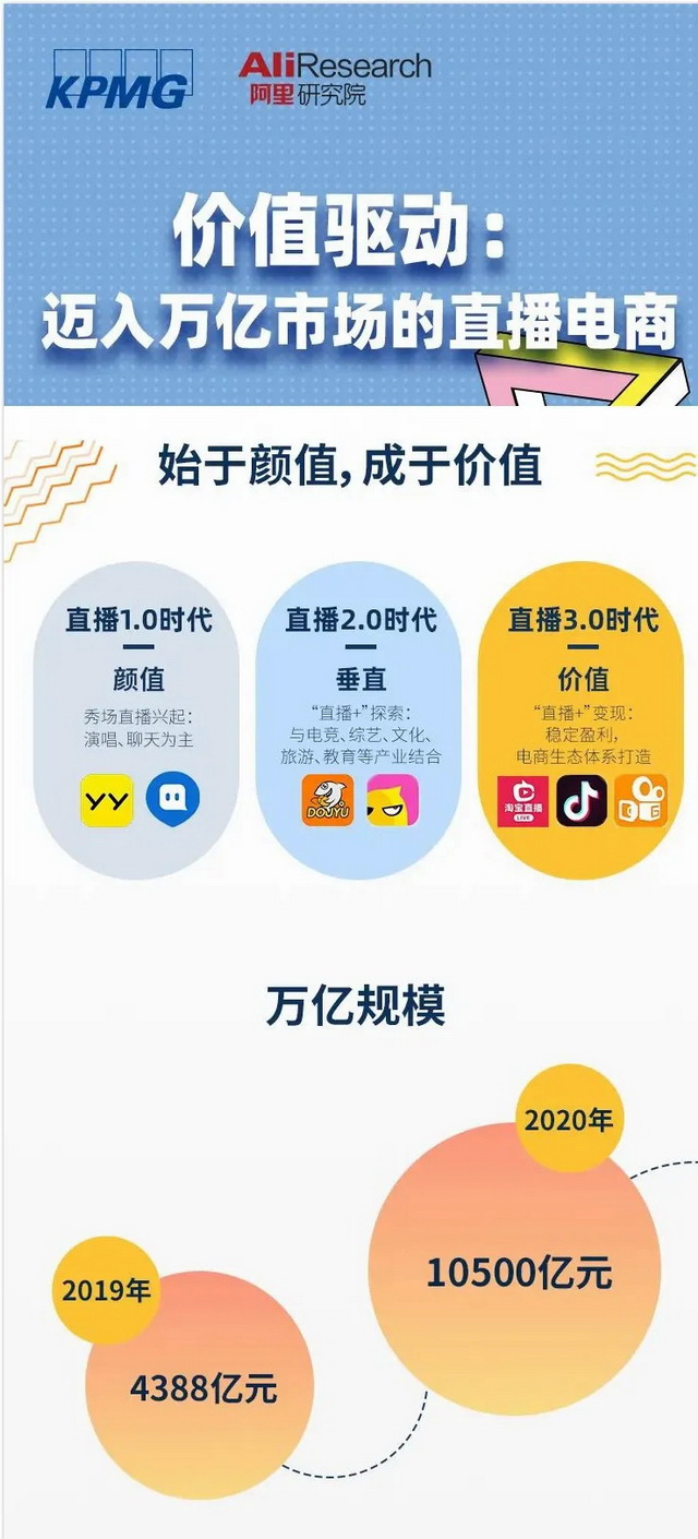 10月12日,毕马威联合阿里研究院发布《迈向万亿市场的直播电商》报告。报告表示, 2019年直播电商整体市场规模达到4338亿元,今年直播电商的市场规模将达到10500亿元,明年将继续保持高速增长,规模接近2万亿元。从渗透率来看,去年直播在电商市场中的渗透率仅为4.1%,2021年直播电商渗透率将达到14.3%。