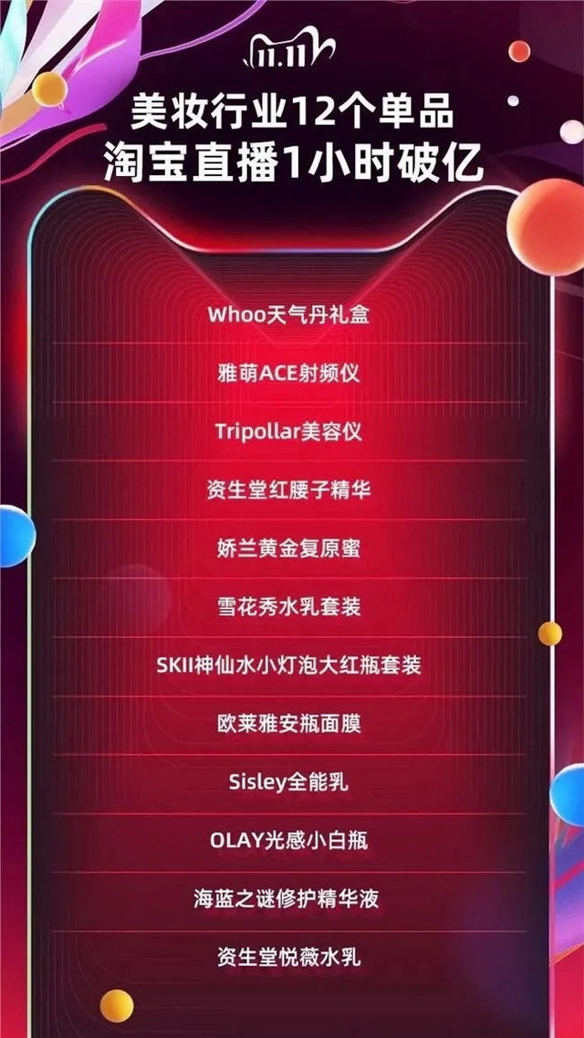 在淘宝直播,12个美妆单品1小时销售额过亿。来看看这些#行业数据#。