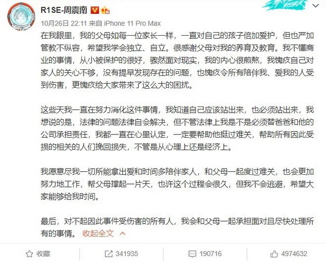 10月26日晚,周震南终于发声,直言自己骤然面对现实,内心非常煎熬,愧疚对家人关心不够,没有提早发现存在的问题,并表示将帮助父母挺过难关。