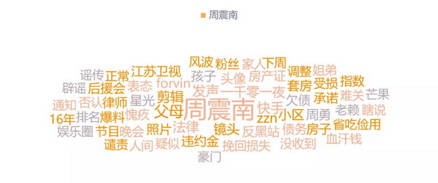 彼时,虽然娱理报道称,有律师表示周震南不应承担父母的债务,但沸腾的舆论对于周震南的失声并不满意。微热点数据显示,在周震南相关词云中,“老赖”、“受损”、“谴责”等负面意味词语成为了高频词。