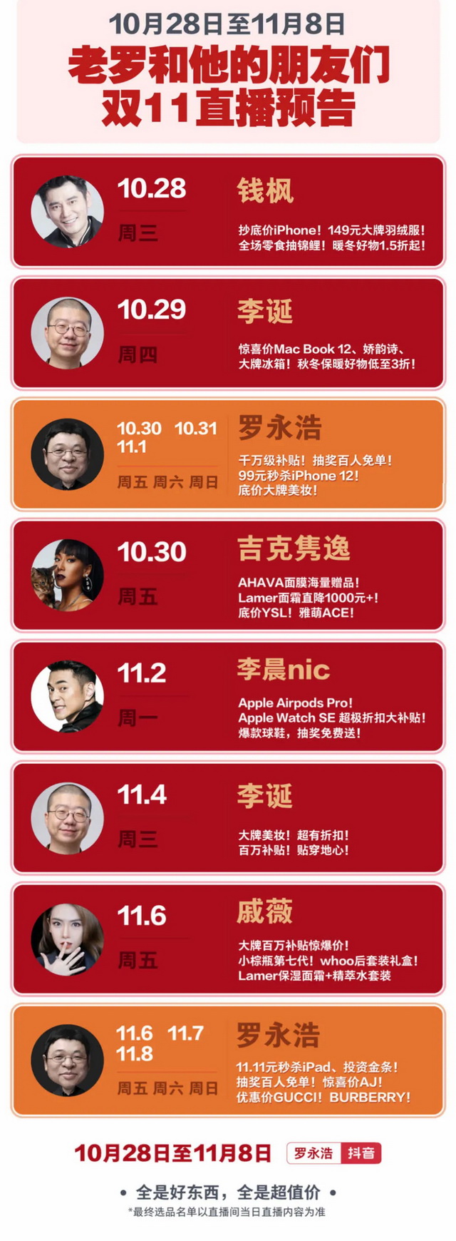 10月27日,罗永浩发布“老罗和他的朋友们”双11直播预告。10月28日至11月8日,钱枫、李诞、吉克隽逸、李晨、戚薇包括罗永浩本人将依次开播。