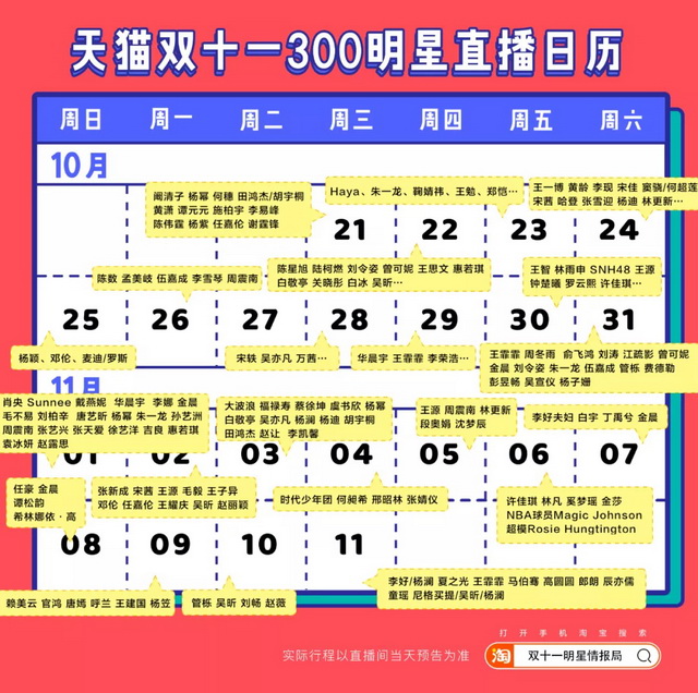 10月26日,天猫发布“天猫双十一300明星直播日历”。从10月21日至11月11日期间,不仅有百位明星坐客淘宝直播间,荣耀、海尔、美的等品牌总裁也将亲自上阵。