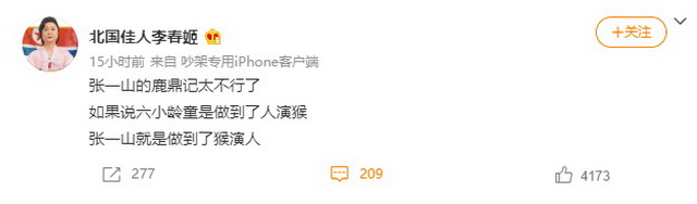 张一山版韦小宝极尽夸张的表情和肢体语言,让观众调侃他把韦小宝演成了“猴儿”。