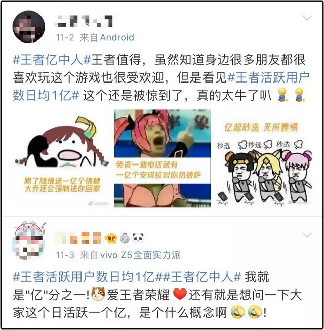 前几天,王者荣耀公布了近一年来的平均日活数据:1亿,这个数字打破了游戏界的记录,也成功惊到了无数网友。话题#王者活跃用户数日均1亿#、#王者亿中人#也成为了热议话题,很多网友骄傲地表示“被惊到了,太牛了叭”、“我是亿分之一”......