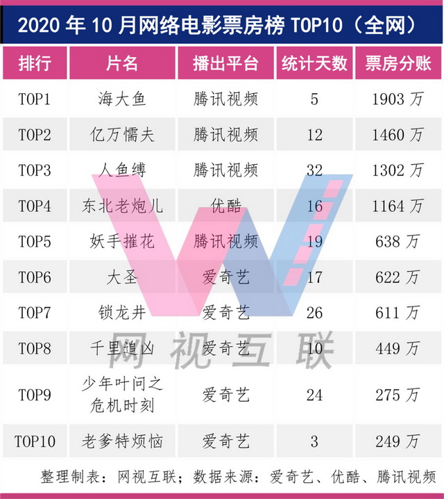 根据爱优腾发布的票房数据,“网视互联”整理出了10月网络电影票房榜TOP10(全网),其中有4部票房破千万。