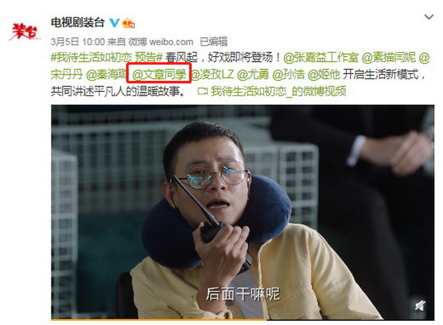 网视互联(ID:wxs360)注意到,3月份《装台》在发布预告片时,官微还特意艾特了文章,而且预告片里也确实出现了文章的镜头。从剧情来看,文章似乎饰演了一位导演。