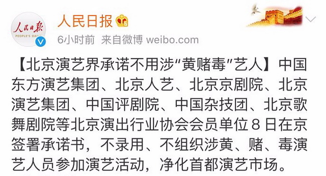 在演出市场,北京演出行业协会发布了《北京演艺行业道德自律行为规范》,北京人艺、北京京剧院、北京演艺集团等200多家会员单位签署了承诺书,承诺“不录用、不组织涉黄、赌、毒演艺人员参加演艺活动”。