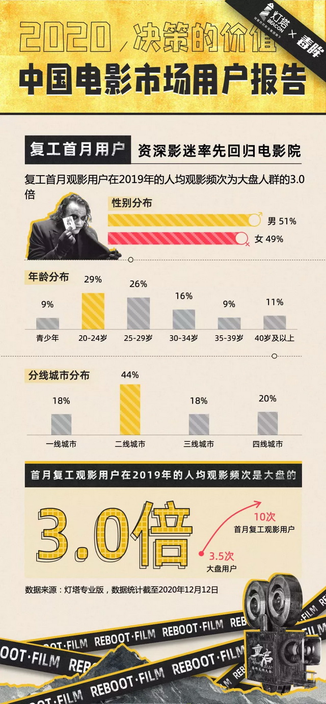 7月20日终于等到影院复工,“观众没有放弃电影”是那个夏天在业内被提及最多的话语。《2020中国电影市场用户报告》显示,影迷群体最先回归影院,复工首月的观众在2019年观影频次是人均频次的3倍。