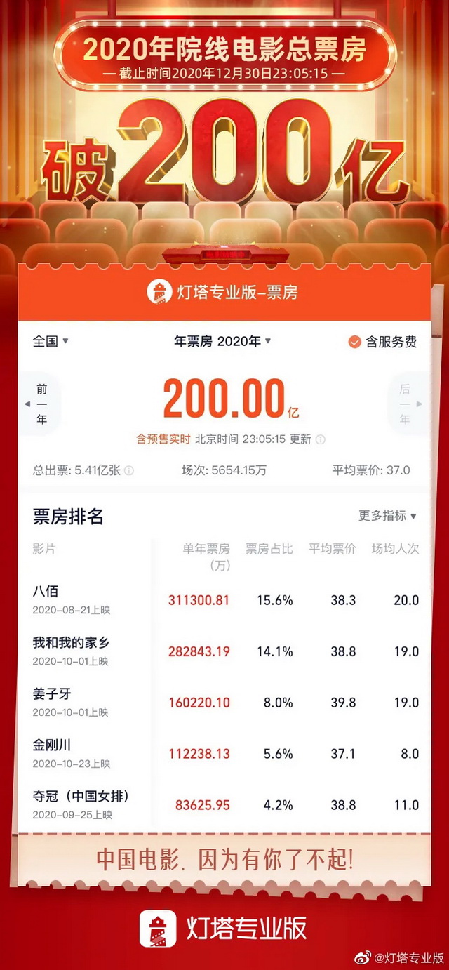 据灯塔数据,2020年中国内地电影票房最终达到了203.06亿。在2020年的最后一天,单日票房达到了5.43亿,远远超出去年同期3.36亿的数据,也创造了新的跨年夜日票房纪录。