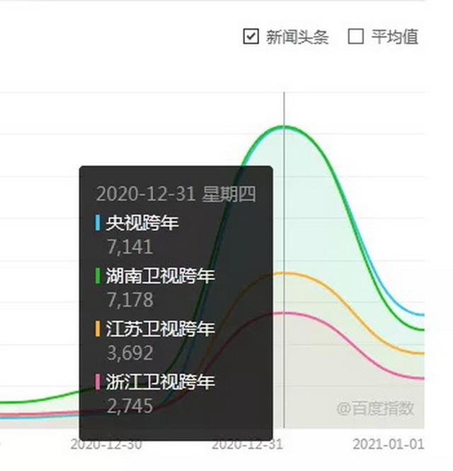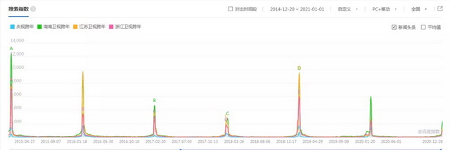 毒眸在酷云热搜神器上检索发现,从2018年到2020年与央视跨年晚会相关的微博热搜数量比之湖南卫视跨年晚会相差了接近一倍。从百度指数上看,央视跨晚从2015年到2020年,搜索量都大不如头部地方卫视跨晚,只有在今年实现“逆袭”。