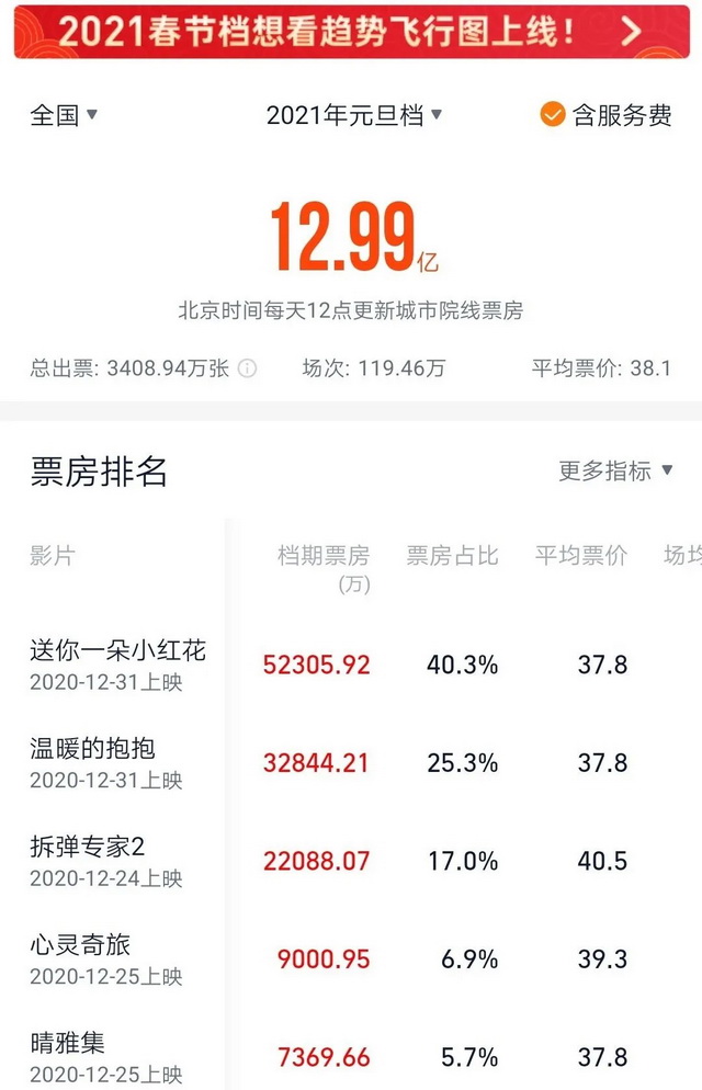 在元旦新上映的6部影片中,《送你一朵小红花》(以下简称《小红花》)和《温暖的抱抱》表现最好,2部影片总票房占比超过60%,而在12月份上映的《拆弹专家2》《心灵奇旅》《晴雅集》也贡献出了不错的票房。