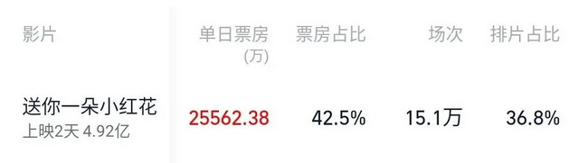 由灯塔数据可知,《小红花》单日放映场次为13万场左右、排片占比维持在30%,上映首日上座率达50%,上映首日便拿下2.36亿票房,成为元旦档冠军。