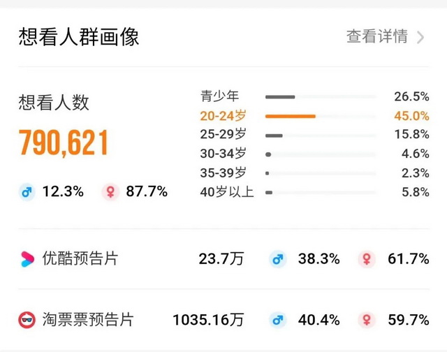根据灯塔数据,《小红花》的想看人群中,24岁以下观众占比达到了71.5%。更多的年轻观众对影片感兴趣,也证明了元旦档发掘增量用户的潜力。