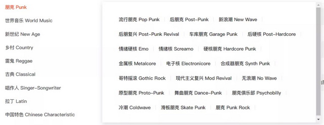 虾米音乐仅“朋克”这一项就有21个细分分类
