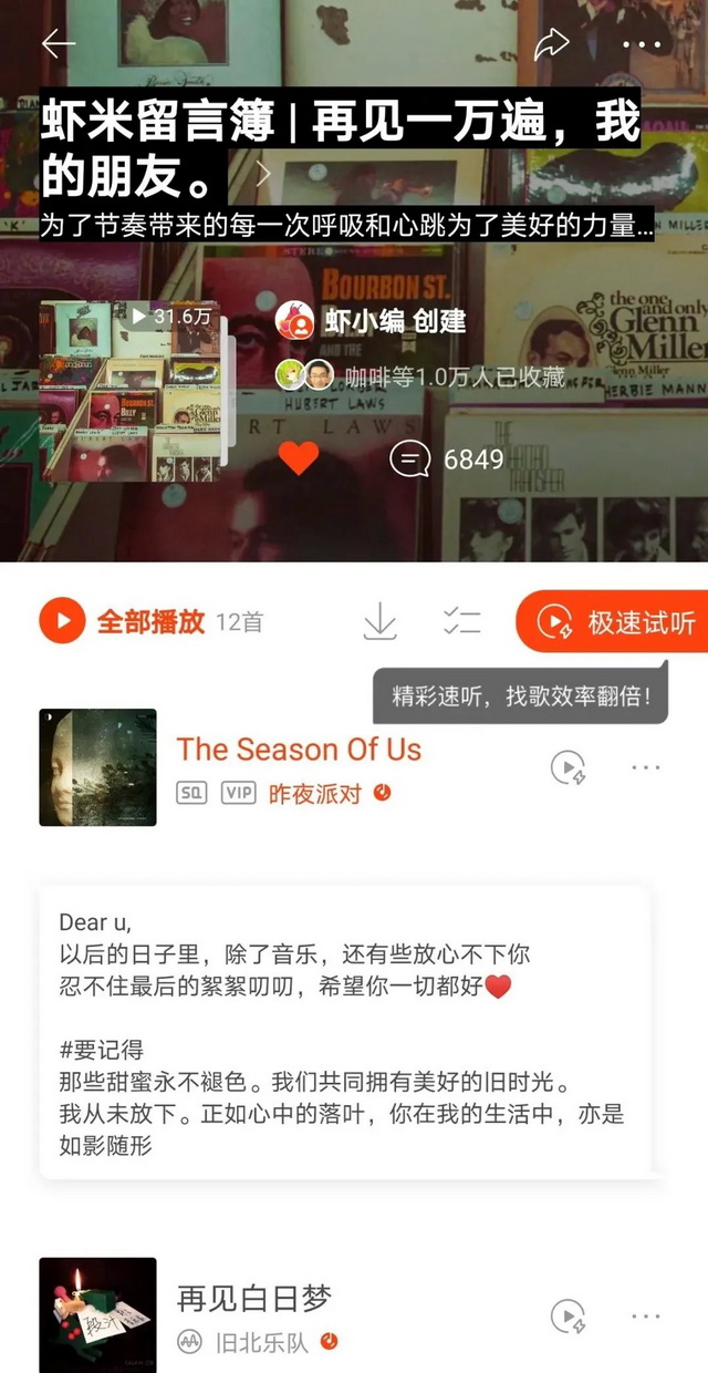 虾米音乐的编辑们,也希望如此。在1月5日的告别公告发出时,虾米音乐编辑部也向往常一样,发出了编辑策划的歌单,名为“再见一万遍”,用白皮书乐队的《清河》,告五人乐队的《披星戴月的想你》等12首歌曲一一道别。