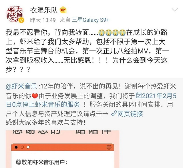 但衣湿乐队和虾米音乐之间的“蜜月期”,并未持续太久。自2015年7月以后,衣湿乐队官微再也没有转发过虾米音乐的相关链接了。而那也是虾米音乐的一个转折点——当月,阿里巴巴集团宣布成立阿里音乐集团,高晓松出任董事长,宋柯出任CEO。而阿里音乐正是由阿里巴巴收购的虾米音乐与天天动听合并组建。