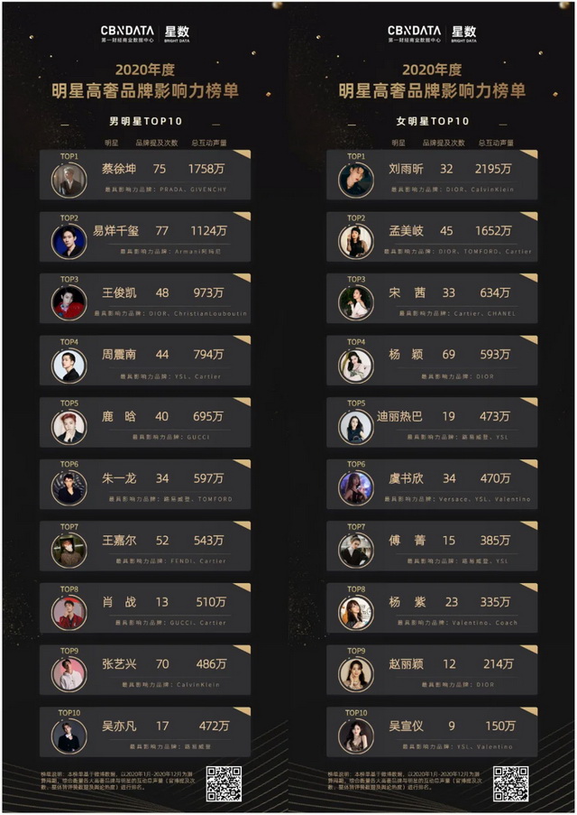 CBNData星数从大数据的角度,对2020年明星与奢侈品合作的影响力效果进行了实际评估。