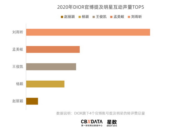 对比其他奢侈品品牌,DIOR在明星运营方面显得老道非常。光是微博账号,就在总号的基础上,又额外开了香氛、护肤、美妆三个分号。据CBNData星数统计,2020一整年,在奢侈品品牌官博提及明星的互动总声量中,DIOR以7024万的总数遥遥领先。