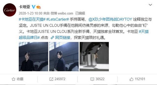 相比GUCCI,卡地亚就要显得“接地气”多了。在电商直播风潮来临的时候,卡地亚选择了“敞开式”的拥抱风潮。2020年1月9日,卡地亚宣布正式入驻“天猫奢品”频道,开设官方旗舰店,两款新产品在天猫上全球独家首次发售,为了此次开业,卡地亚邀请肖战、王嘉尔、周震南、孟美岐四位明星拍摄新品大片,#卡地亚在天猫# 微博话题阅读量达到5.5亿。