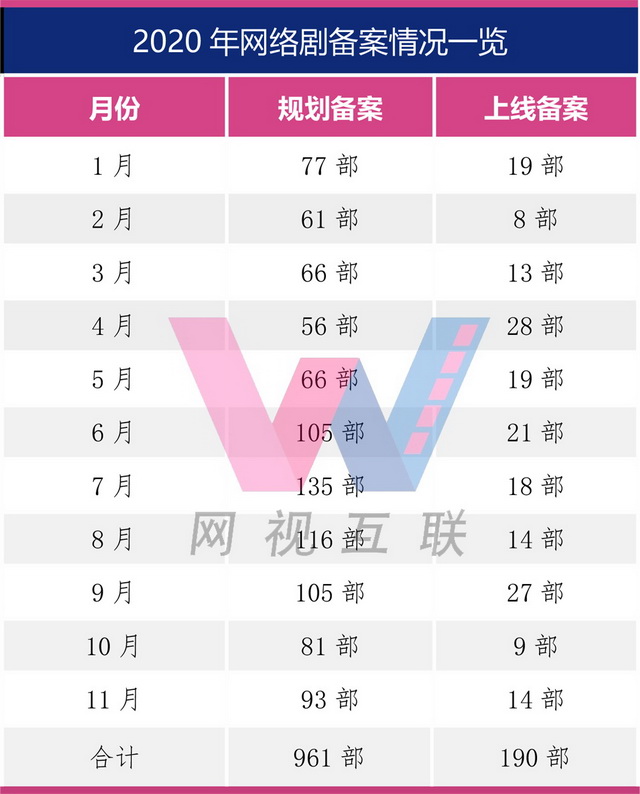 据网视互联(ID:wxs360)统计,截至11月底,2020年通过规划备案的网络剧已经高达961部,基本上与2019年同期持平。取得上线备案号的网剧190部,月均17部。