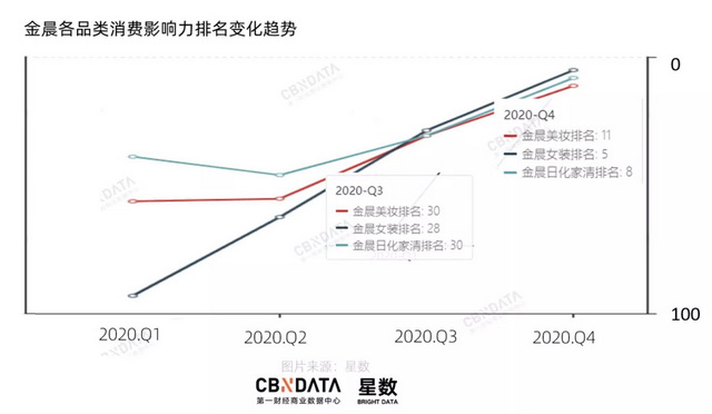 2020年,金晨共新增15个代言,其中四季度中宣的代言占到6个,涉及美妆、日化家清、服饰鞋包等多个品类。根据CBNData星数淘系带货指标,金晨该季度在多个品类排名均有明显上升,其中女装与日化家清品类分别上升23与22位。总榜中,金晨也直接由上一季度的36名空降至12名,成为女明星消费影响力总榜第7位,商业价值进步尤为明显。
